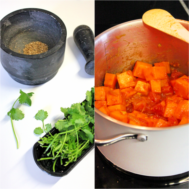 - Retiramos do lume e acrescentamos os coentros, picados grosseiramente.