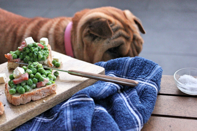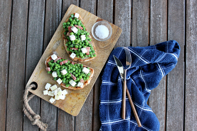 - Serve a mistura de ervilhas e bacon sobre fatias de pão rústico previamente tostadas e acrescenta queijo feta a gosto.