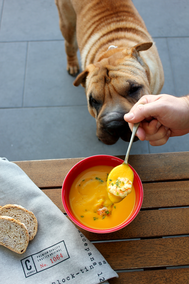 - Distribuímos o creme pelos pratos de servir e dispomos o camarão no topo. Finalizamos com cebolinho a gosto.